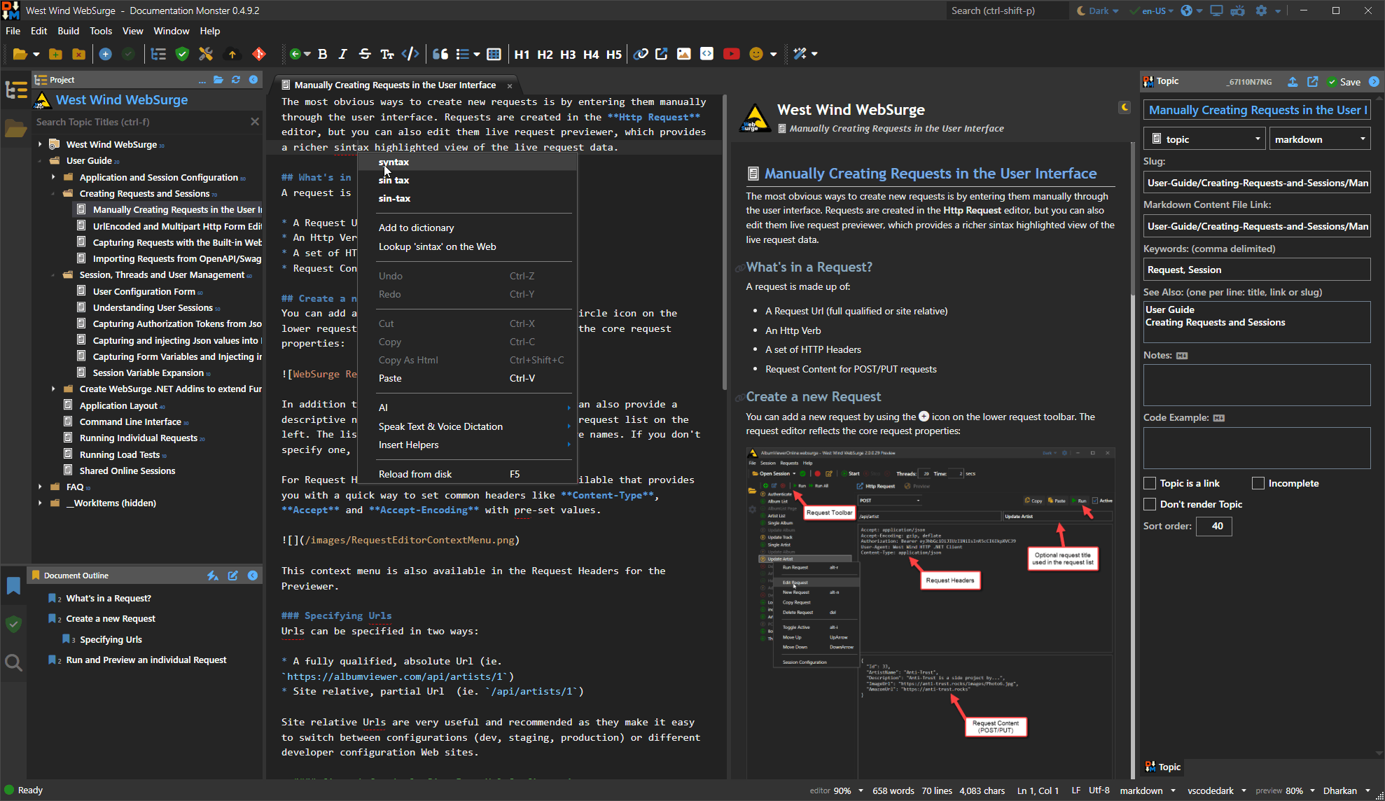 You can quickly create a project of related topics. Keep it simple with a flat topic list, or create a nested hierarchy of linked topics. You can drag and copy topics around, sort and otherwise manage your project. Documentation Monster optimizes the workflow and lets you quickly add topics, create rich Markdown content, edit topic meta data, and immediately generate output from your project or individual files. All the while you can see what your output looks like while you type. The core feature centers around your content and the rich topic editor with it's live synced preview, that makes it easy to create content from text, images, topic links and external links. It does so via intuitive tools that make content creation quick and natural. AI based writing tools can help with content suggestions, summaries, and spell and grammar checking.